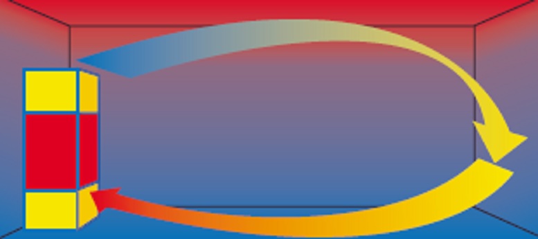 For cooling, the Air Turnover system continuously recirculates large volumes of air to eliminate the room’s thermal barrier. The result is a “comfort zone” from the unit discharge down to the floor level. Extending the height of the discharge increases the height of the comfort zone. Air in the comfort zone turns over 3.5 to 5 times each hour.