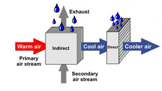 An direct/indirect evaporative cooling system combines two stages of evaporative cooling. The first stage is the "indirect" stage. In this stage air is cooled by passing over a heat exchanger that has cooled water pumped through it. The water that is pumped through heat exchanger can be cooled in several fashions but in this case the water is cooled in an evaporative cooling tower that is attached to the unit and the water flows through a conventional copper tube/aluminum fin coil. Water does not touch the resulting cool air. The second stage is a direct evaporative cooler. A direct evaporative cooling system works by using a fan to draw outside air through a cellulose or fiberglass media that has been saturated with water. Due to the internal geometry of this media, a turbulent mix of air and water is created which optimizes heat transfer. An air washing effect is also created which removes most dust and dirt from the air stream before the air flows into the work area providing a clean, cool environment.
